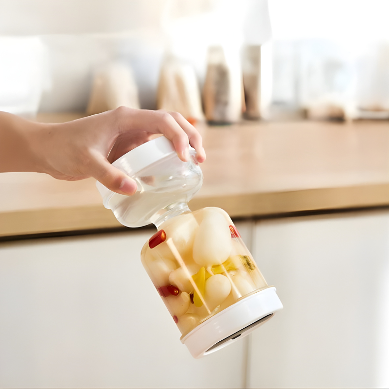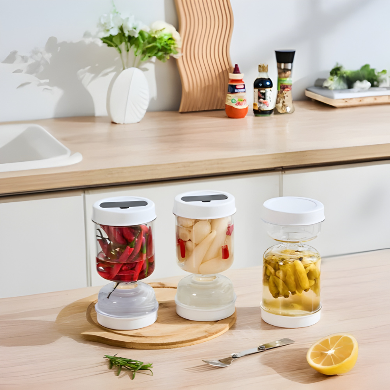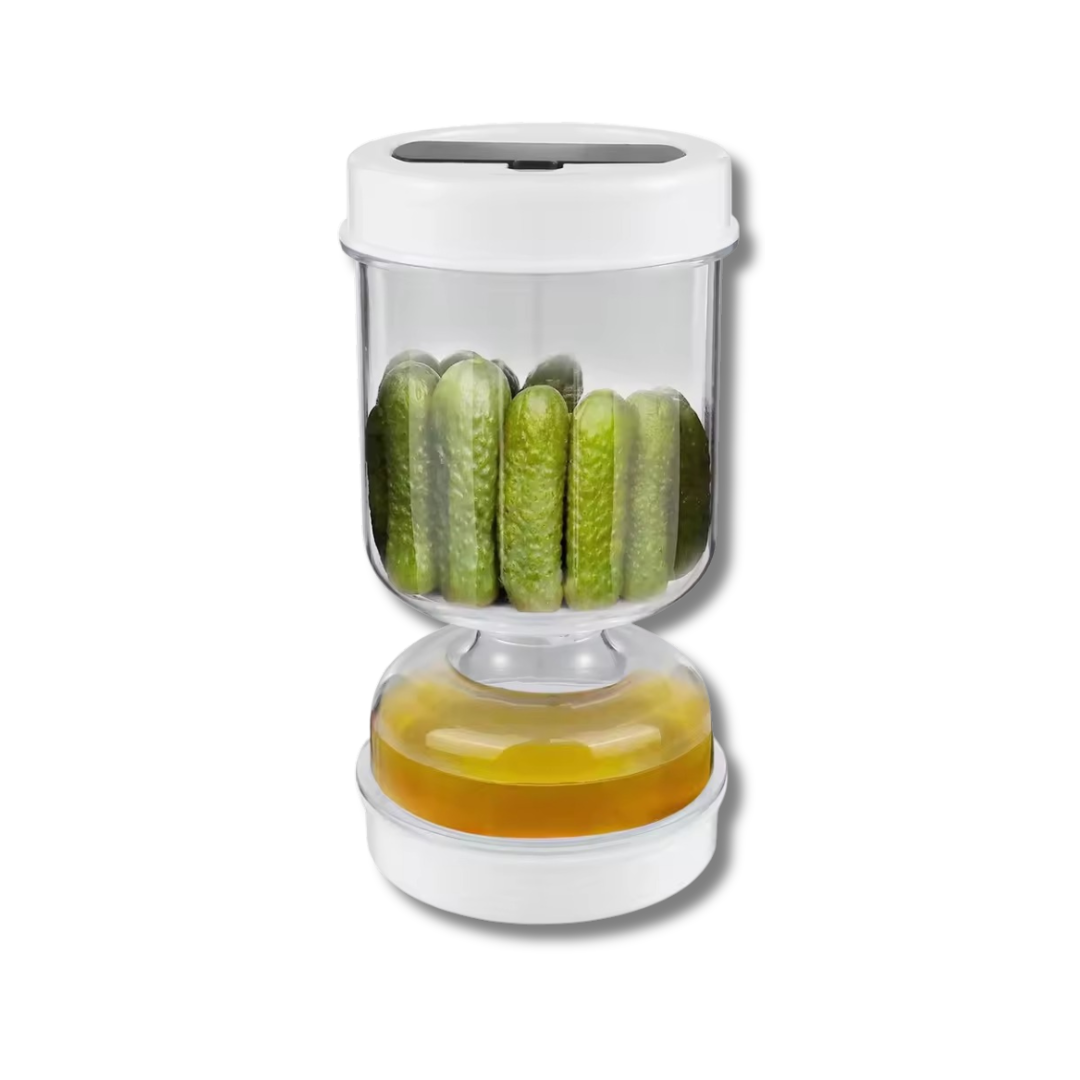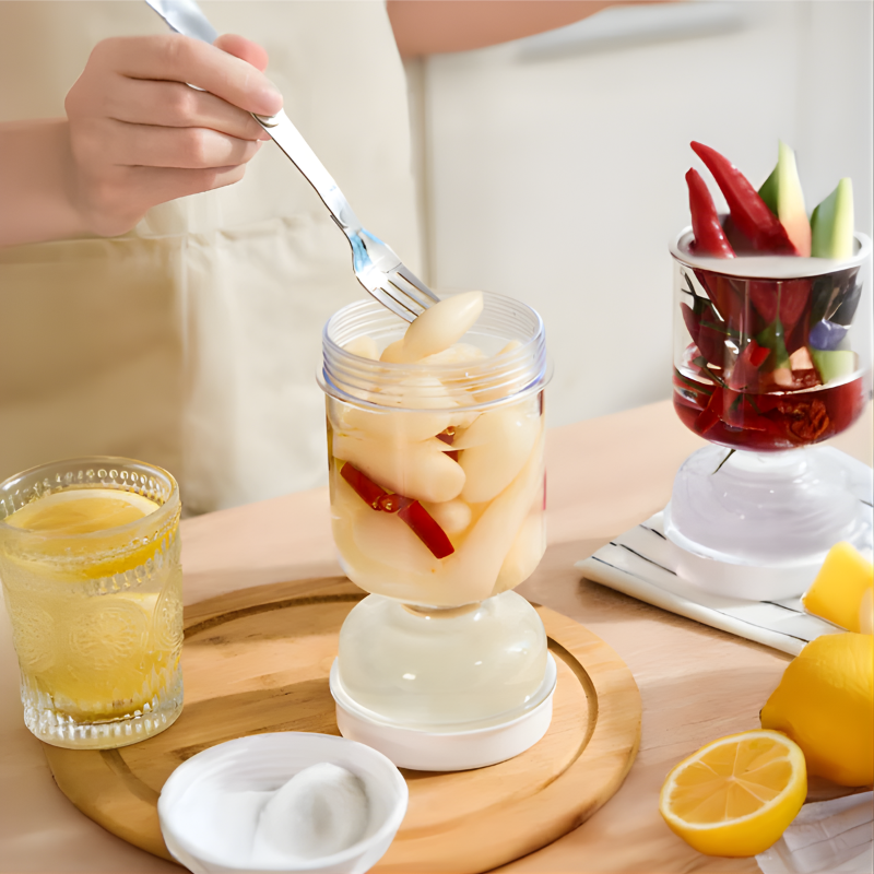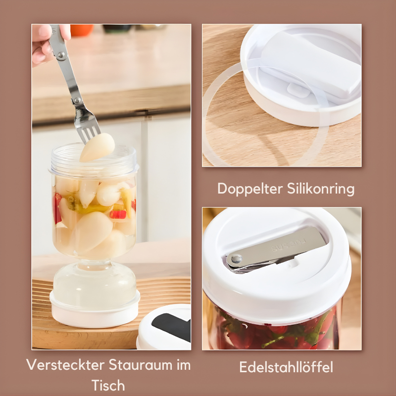 Einfach das Glas auf den Kopf stellen, und schon sind die Pickles griffbereit – kein Herumwühlen, kein Warten.