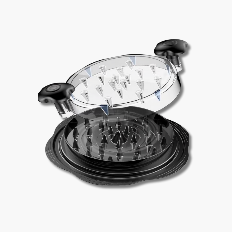 Durch den durchsichtigen Deckel müssen Sie nicht unnötig lange drehen, denn Sie sehen genau, wann das Fleisch die gewünschte Struktur erreicht hat. Der Boden ist mit einer rutschfesten Beschichtung für zusätzlichen Halt versehen. Die Griffe sind ergonomisch geformt und das Fleisch kann beim Drehen nicht an den Rändern herausfallen. Das spart eine Menge Reinigungsaufwand.